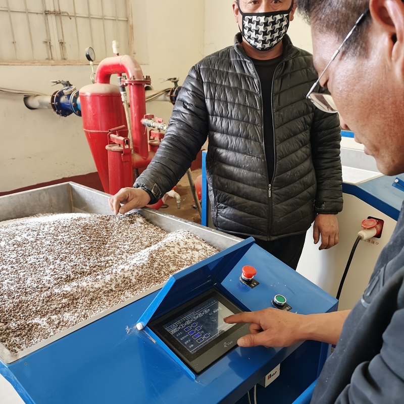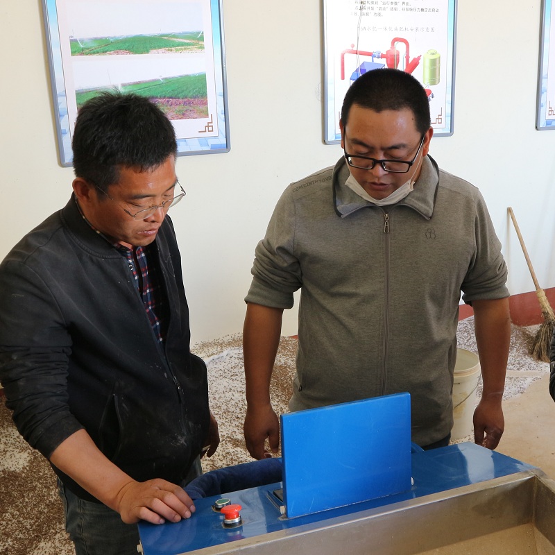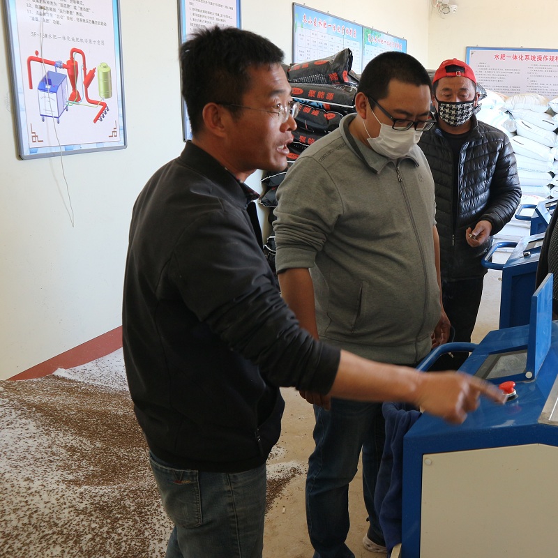 我公司人員到達滄州市南皮縣鮑官屯鎮張旗屯村“農業農村部水肥一體化示范區”后,看到小麥的水肥一體化施肥灌溉正在井然有序的進行著。種植戶在熟練的操作我公司生產的SF-16W型智能灌溉施肥機進行施肥灌溉。種植戶熱情的接待了我公司人員,我公司人員與種植戶詳細交談溝通,詢問了智能灌溉施肥機和灌溉設備的使用情況。種植戶表示非常滿意,SF-16W型智能灌溉施肥機不但可以施肥,還可以進行輪灌組的切換,施肥灌溉直接在施肥機上就操作完成了,原先需要十幾個人施肥澆水,現在兩個人就能完成,真是操作簡單方便,省工、節肥、節水,功能強大。